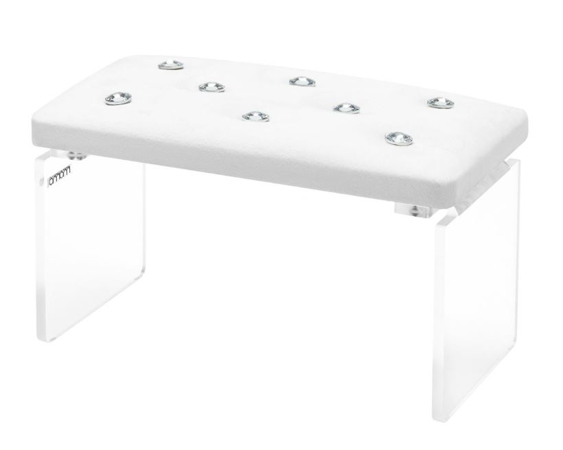 Odpowiednia wysokość podpórki zapewnia wygodną pozycję zarówno dla klienta, jak i dla stylistki. Poprawna postawa stylistki minimalizuje obciążenie kręgosłupa, skutecznie redukując ból pleców, a klientce zapewnia to większy komfort i relaks. Silikonowe elementy na nóżkach chronią blat przed zarysowaniami i zapobiegają przesuwaniu się na stole, gwarantują stabilność. Stelaż z tworzywa sztucznego i elegancki welur zapewniają długą trwałość produktu, a ozdobne kryształki nadają mu wyjątkowy wygląd.