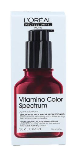Vitamino Color Spectrum serum to profesjonalna technologia pielęgnacji koloru zapewniająca wielowymiarowy blask koloru kosmetycznego z efektem laminowanych włosów. Zabieg ten pomaga zatrzymać pigmenty koloru we włosach, dzięki czemu kolor pozostaje intensywny już od pierwszego dnia koloryzacji. Serum nabłyszczające Vitamino Color Spectrum Glass Shine marki L'Oreal Professionnel zapewnia natychmiastowy i długotrwały połysk do 5 myć. Wzbogacone o 5% alfa-silanu, produkt tworzy warstwę ochronną na powierzchni włosów, która aktywowana jest pod wpływem ciepła narzędzi do stylizacji.